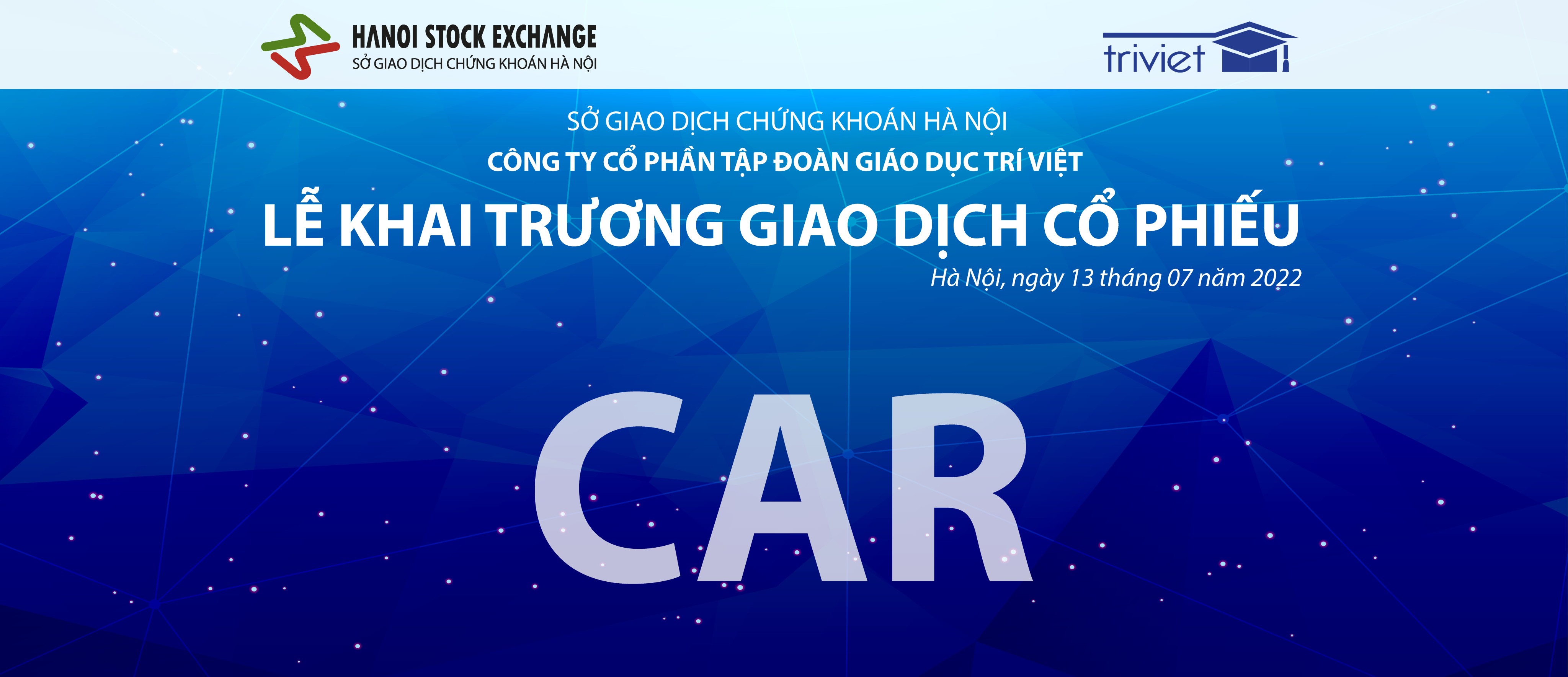 Ngày 24/06/2022, Công ty Cổ phần Tập đoàn Giáo dục Trí Việt (Trí Việt) chính thức được Sở Giao dịch Chứng khoán Hà Nội (HNX) chấp thuận đăng ký giao dịch Cổ phiếu với mã chứng khoán CAR.