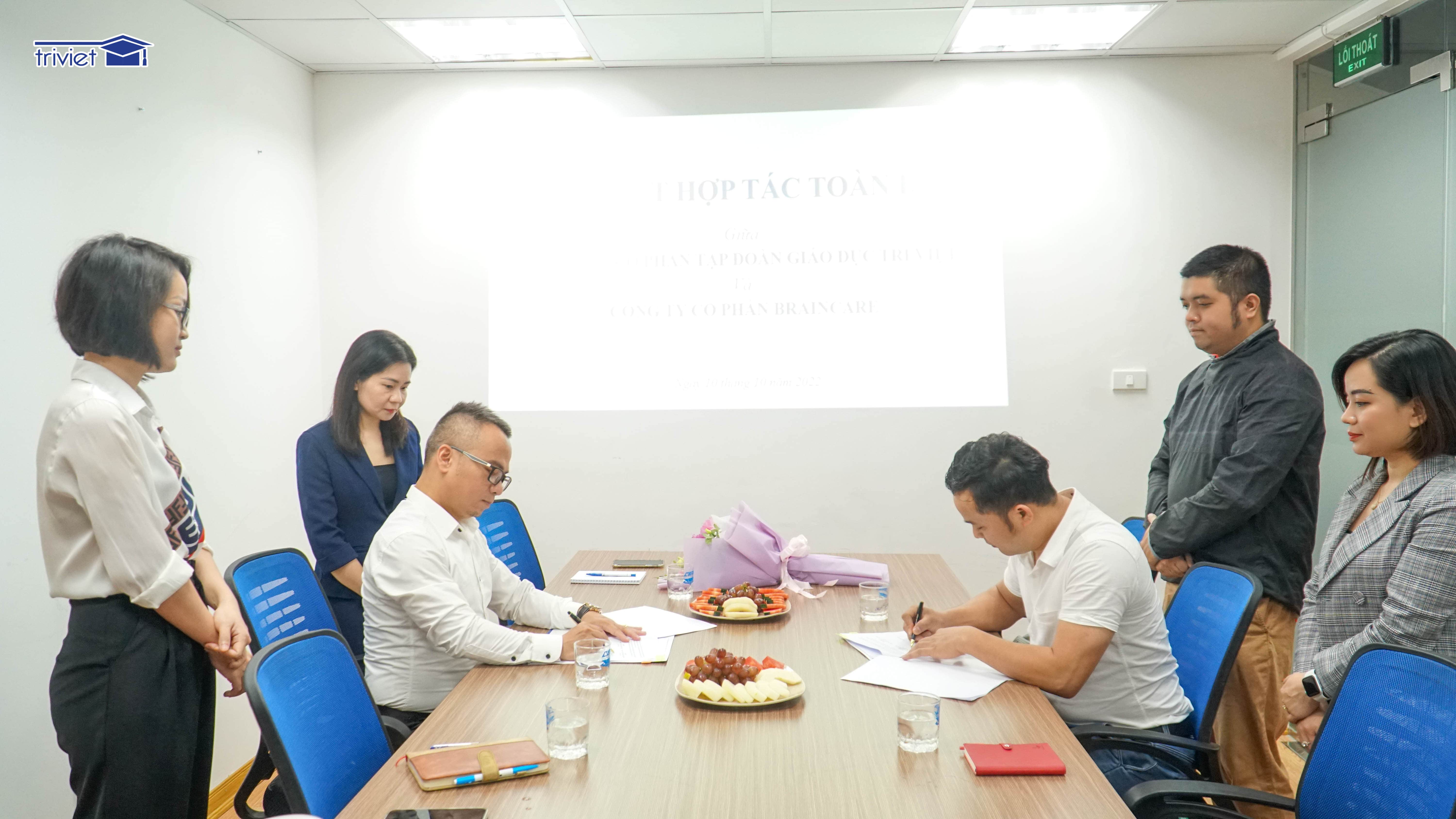 Tại buổi lễ, Ông Đào Đức Việt - Tổng Giám đốc Công ty Cổ phần Tập đoàn Giáo dục Trí Việt và Ông Trần Phúc Quỳnh - Giám đốc Điều hành Công ty Cổ phần Braincare đồng chủ trì lễ ký kết. Dự lễ còn có sự góp mặt của các đồng chí lãnh đạo là Bà Nguyễn Thị Thanh Xuân - Kế toán trưởng và Bà Vũ Hoa Mai - Phó Phòng Hành chính Nhân sự Công ty Cổ phần Tập đoàn Giáo dục Trí Việt cùng Bà Nguyễn Hiền Minh - Giám đốc Dự án, Ông Nguyễn Anh Vũ: Trưởng nhóm Marketing Công ty Cổ phần Braincare.